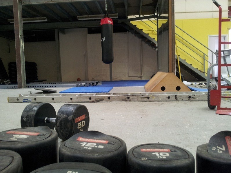 Currently there is a large van parked in the corner where I can see myself hitting a few farmers PBs in the near future; Chris assures me there will be at-least a 25 meter run kept clear for the farmers and yokes, sleds or other movement training, weather permitting and with the large warehouse shutters up… well you can go until you puke if you like.Across from the van, under the stairs up to the changing rooms and showers, a dark-warm matted corner promises heavy-bags, conditioning kit and MMA specific training, whilst next to it is an 18 square foot matted area for Olympic lifting and barbell work, whilst along from there across a huge back-wall is an area that promises cross fit style frames, climbing ropes and piles of medicine balls. A few other bits of kit I can see scattered around are some half-built competition bench’s and large power-racks.